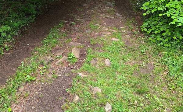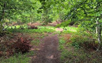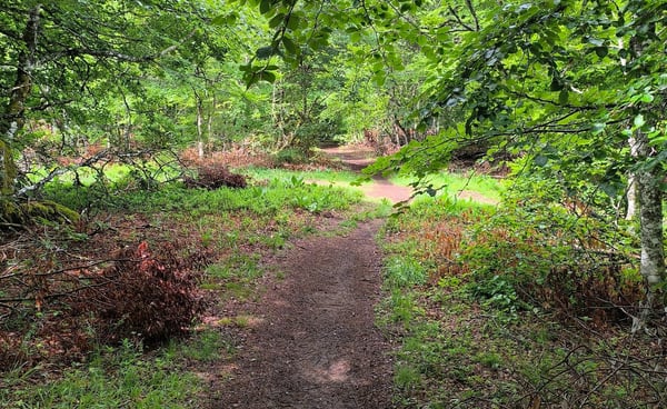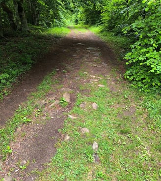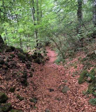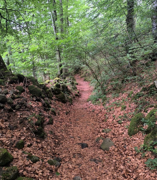 Puis, il est temps d'attaquer la descente, la pluie s'est arrêtée et nous rangeons la cape définitivement. Le parcours se poursuit dans des petits chemins au cœur des forêts de bouleaux, de frênes et de chênes.