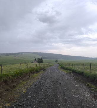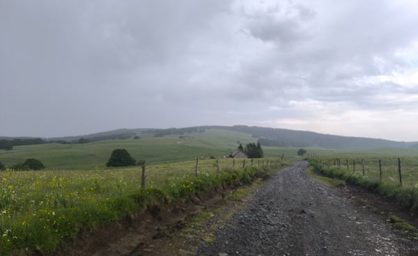 Troisième étape, nous partons une fois n'est pas coutume sous la pluie. Départ du relais des lacs sur le plateau, sur des chemins d'estives au travers de vaches qui se moquent comme de l'an quarante de la pluie.