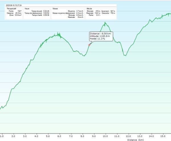 Nous finirons donc la journée au bout de plus de 25 kilomètres sur le foirail de Laguiole. Extenué mais ravi de l'avoir fait. Plus de 950 de D+ quand même sur l'ensemble de l'étape. La vitesse moyenne de déplacement prouve la dureté de l'étape. Mais vous connaissez le dicton : Qui veut aller loin ménage sa monture.