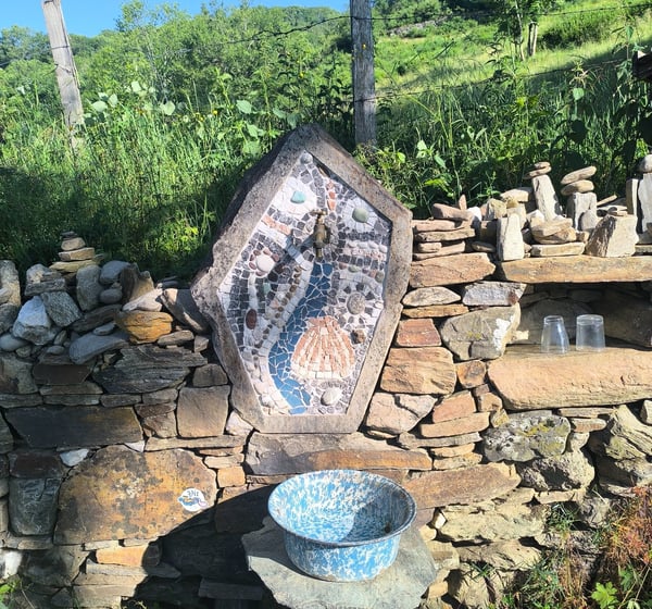 Dès les premiers kilomètres, nous nous élevons vers le plateau de l'Aubrac. Il fait frais (10°) mais ce n'est pas désagréable sur cette première partie de montée. Nous faisons toujours route avec les Saint-Jacques et nous pouvons voir ici et là certains monuments à leur gloire.