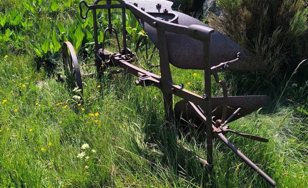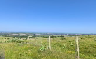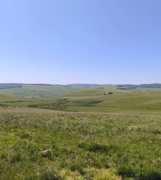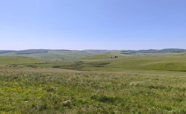 Puis nous basculons sur l'autre versant pour voir le spectacle sur les pâtures de l'Aubrac, la Lozère, Nasbinals et la vallée du Bès. On peut distinguer ça-et-là des burons qui sont construits à flan de colline. Pour rappel le buron était le lieu de vie pour les hommes comme pour les bêtes pendant les estives. Certains d'entre eux servaient à fabriquer le fromage et maintenant ils abritent de bons restaurants où il fait bon manger.