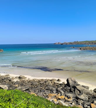 Le parcours se poursuit sur des petits chemins dans l'herbe basse. Nous sommes baignés de soleil et bercés par les vagues, un vrai délice. Le paysage est totalement différent de celui de la première semaine mais tout aussi magnifique. Les variations de couleur des chemins, des pierres mais aussi de l'eau sont bluffantes. Nous allons de surprise en surprise à chaque passage d'une pointe ou d'un récif.