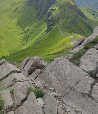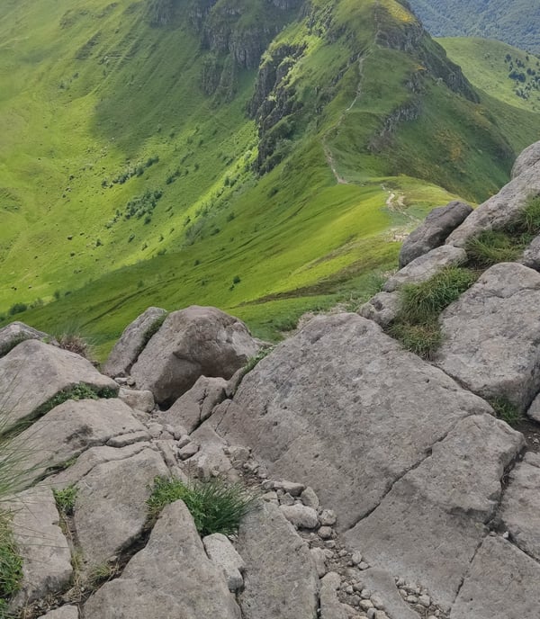 Passé ce chemin de crête, nous attaquons la descente sur le Lioran. Celle-ci se fait en partie sur les pistes de ski. Ça fait mal aux guibolles car les pentes sont raides mais ce n'est pas grave. L'orage menace et nous accélérons le pas pour ne pas rentrer mouillé.