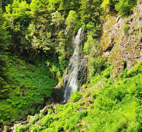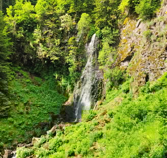 Puis vient le début de la descente vers Murat. Nous devons renoncer à suivre la trace de notre GPS car le tracé du GR a changé à cause d'un abruti menaçant tout randonneur de tirer à vue. Ce nouveau chemin imprévu nous prive du chemin de crête mais nous fait découvrir deux belles cascades, une maison troglodyte et ... nous rallonge notre dernière épreuve de 3 kilomètres et un peu de dénivelé.