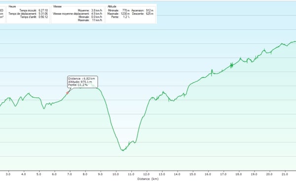 Au final, cette étape était dure mais intéressante. Rondement menée, nous avons parcouru les 24,32 kilomètres en un peu moins de 6 heures 25. Avec un dénivelé positif de 929 mètres.