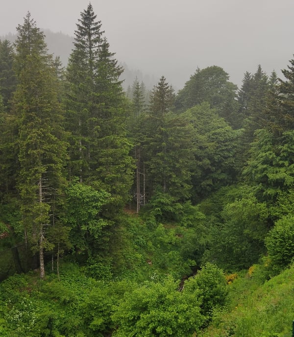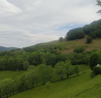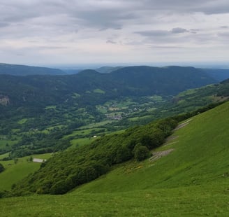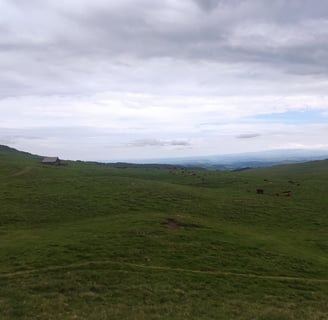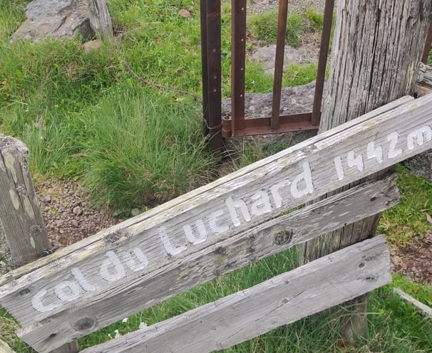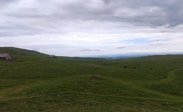 Départ tout en montée pour atteindre le col du Luchard. Les jambes sont lourdes et le temps n'aide pas à se motiver, du gris et du gros temps qui s'annonce. Une fois sur le plateau, les vaches Salers et leurs veaux nous accompagnent dans les pâturages. Nous accélérons le rythme car le temps menace.